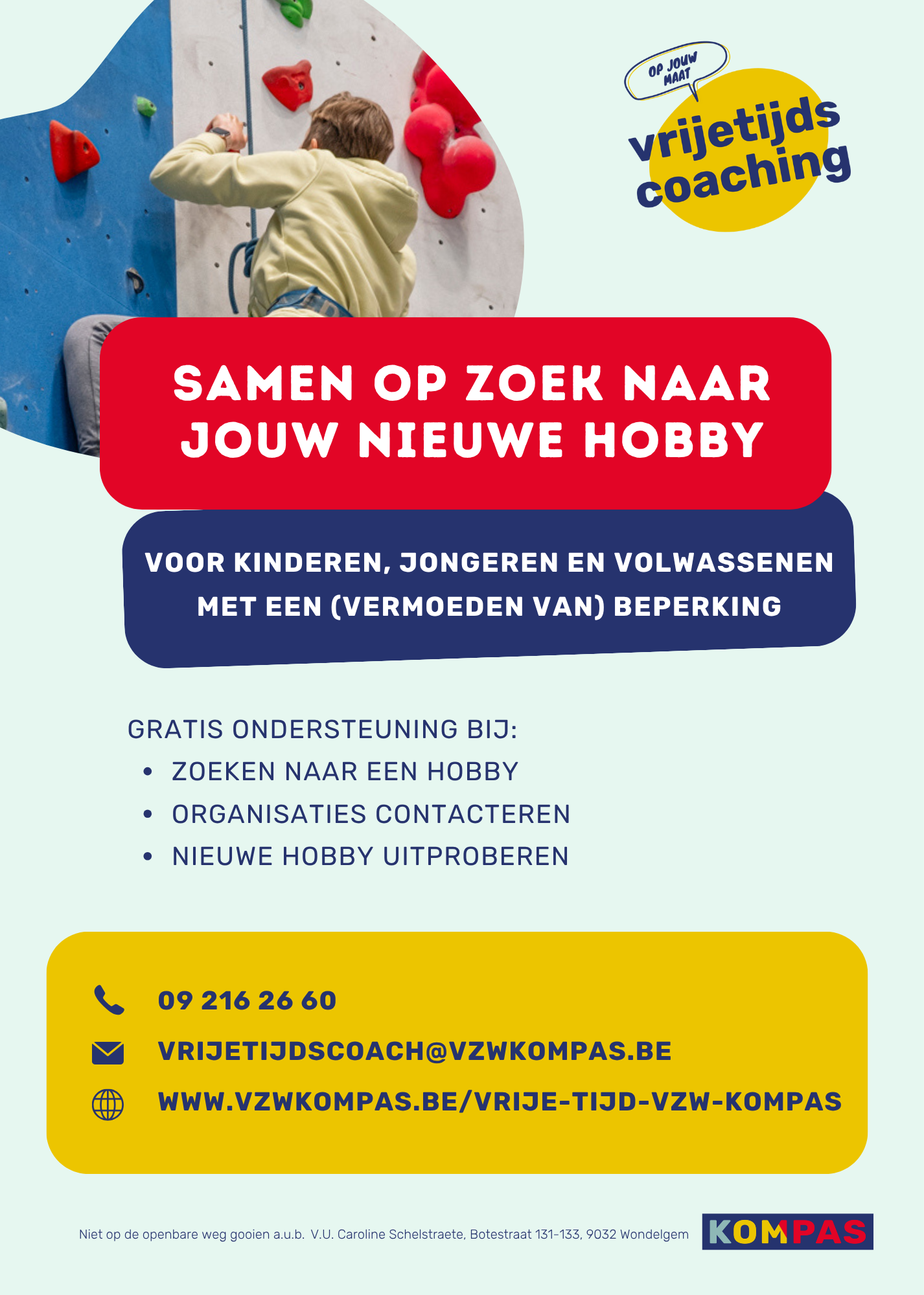 We kunnen jou ook individueel begeleiden & samen zoeken naar een toffe hobby op maat! We werken de drempels weg om deel te nemen aan activiteiten van een ‘gewone’ club of vereniging. Voor deze begeleiding is een VAPH erkenning niet noodzakelijk. Bij voorkeur woon je in regio Gent en woon je niet in een residentiële setting. De dienstverlening is gratis. Bekijk ook onze flyer. Interesse? Bel 09 216 26 60 of mail naar vrijetijdscoach@vzwkompas.be.